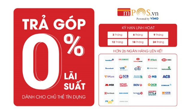 Dịch vụ mua hàng trả góp 0% bằng thẻ tín dụng, mPos là đơn vị trung gian kết nối với hầu hết các ngân hàng và tổ chức tài chính tại Việt Nam, nhằm mang lại sự tiện ích khi mua hàng của người dân và khi bán hàng của doanh nghiệp.